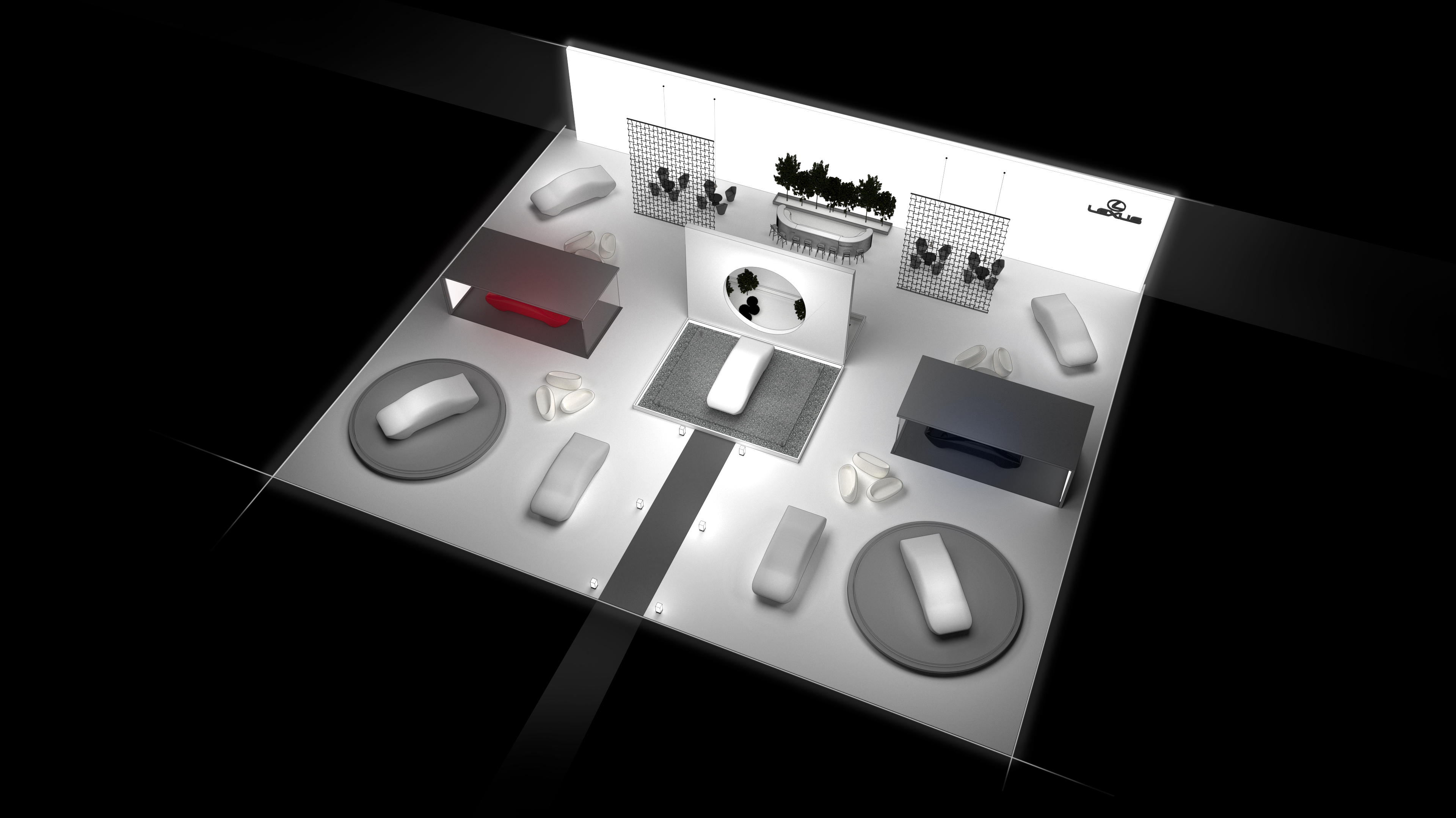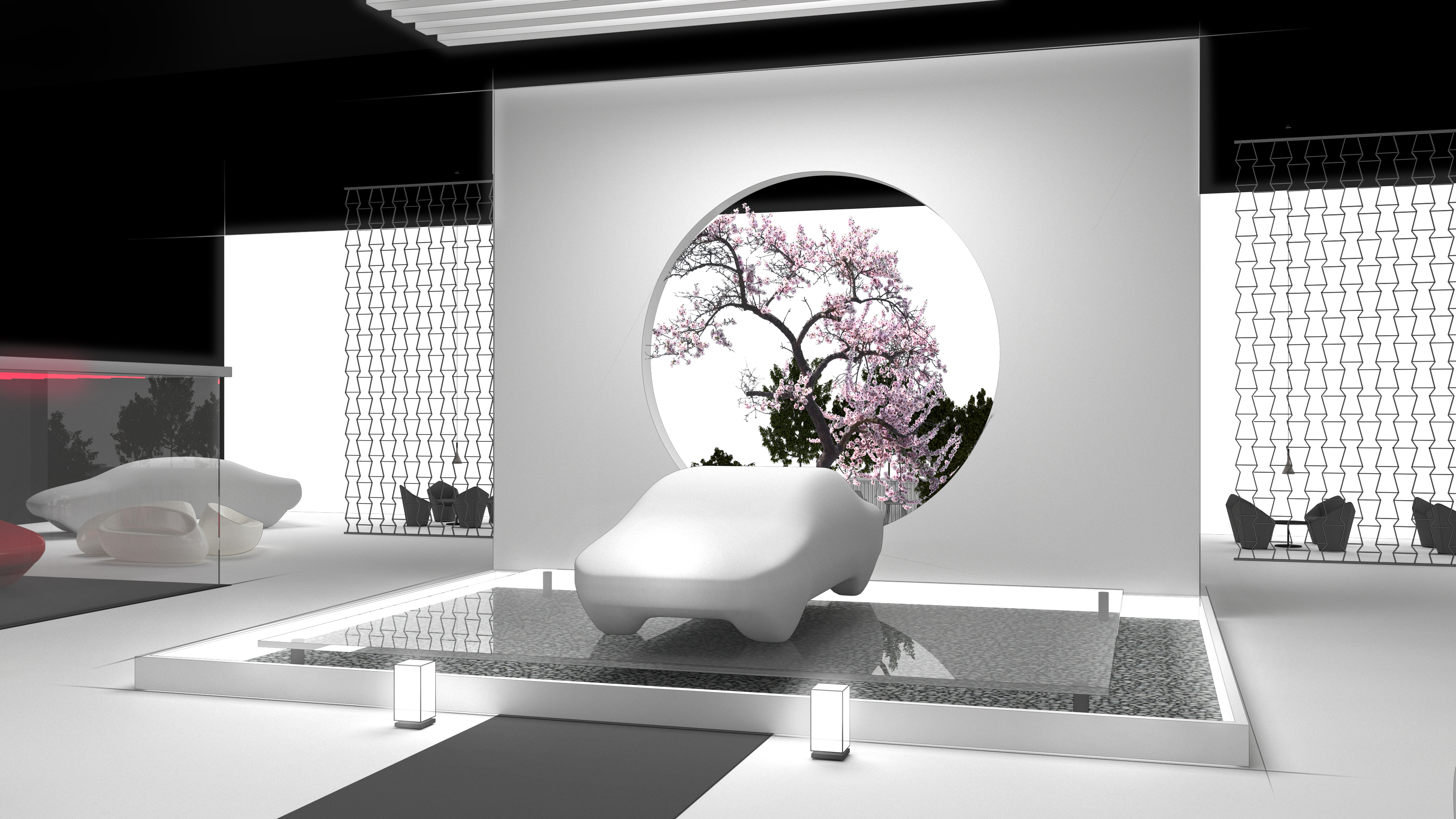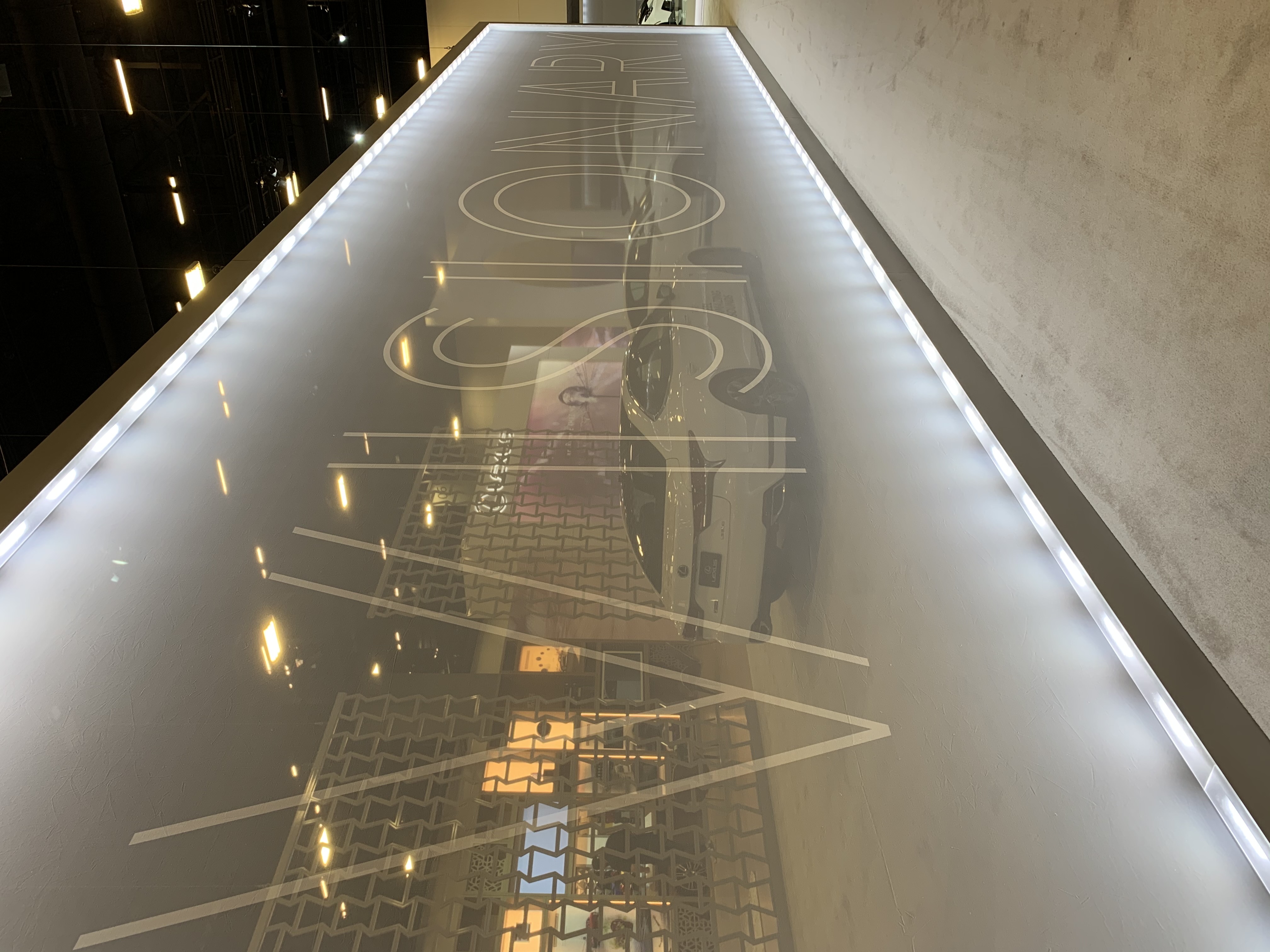 In the middle of the space, the feature vehicle is framed by the oculus wall. This element serves as signature for the space creating a sense of curiosity and as used in Japanese architecture also considered to express the universe and to represent the state of enlightenment.