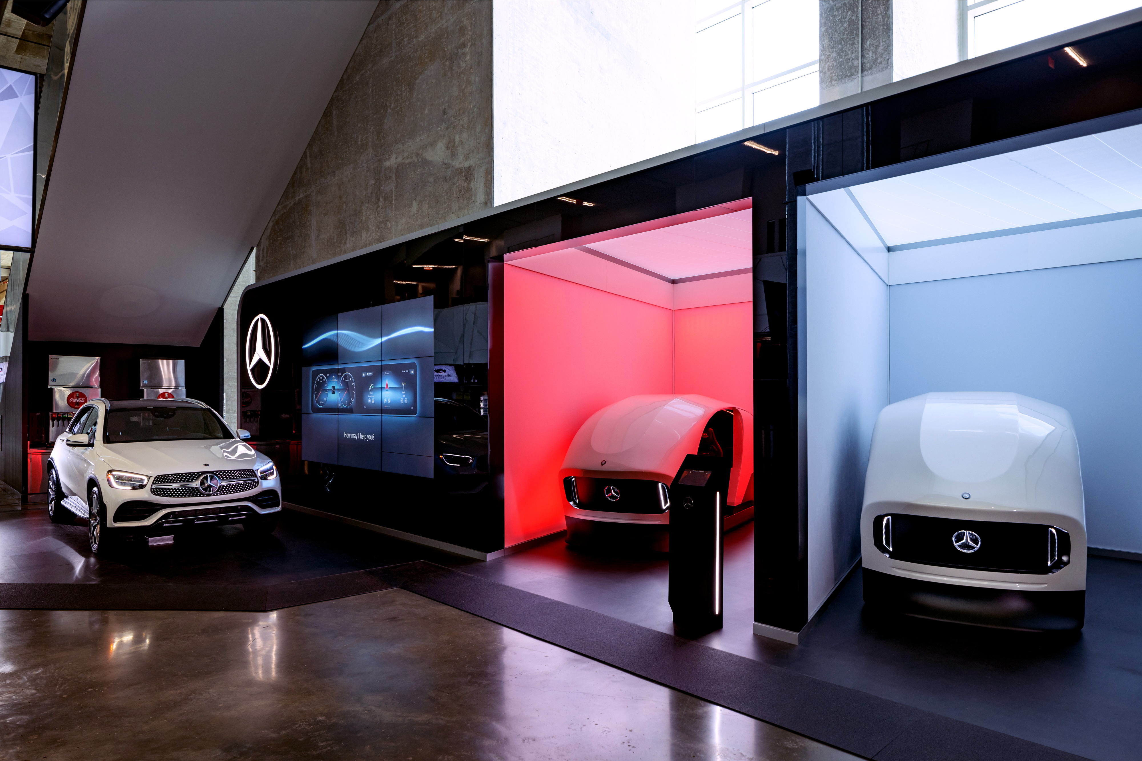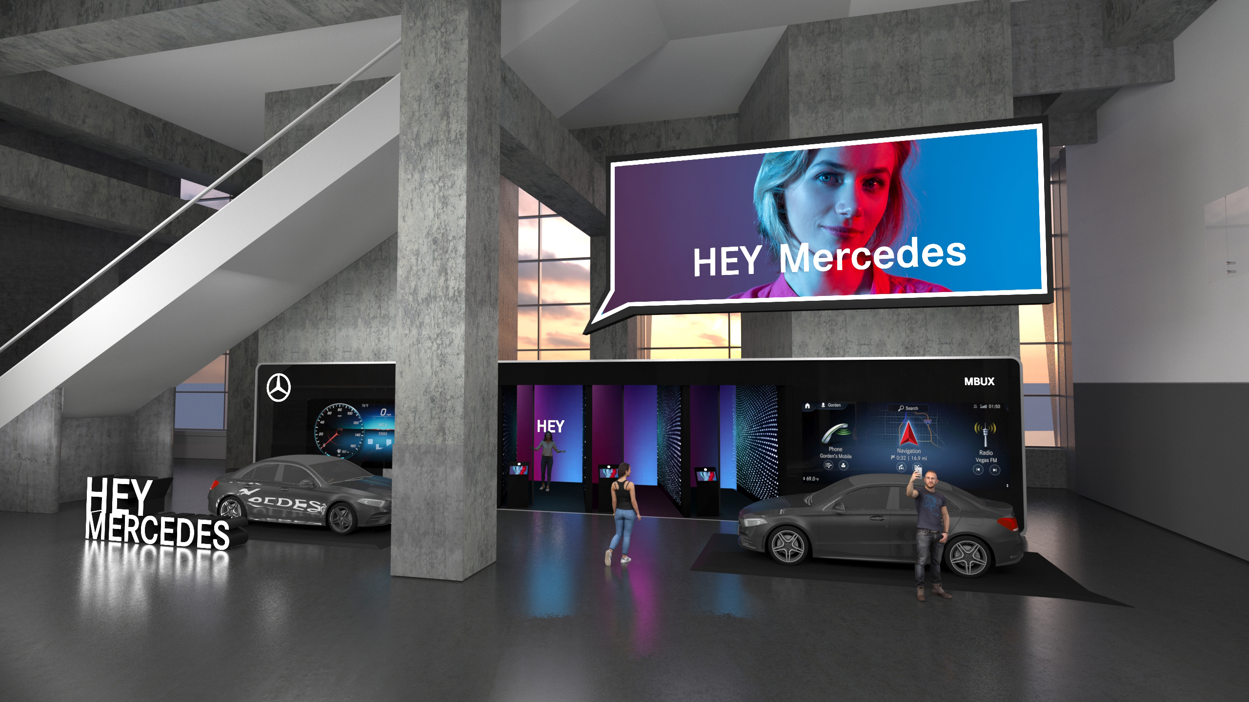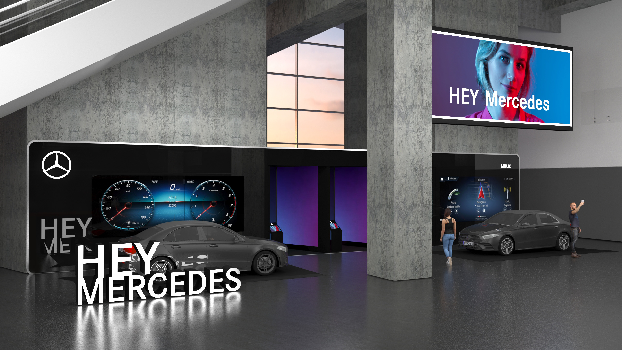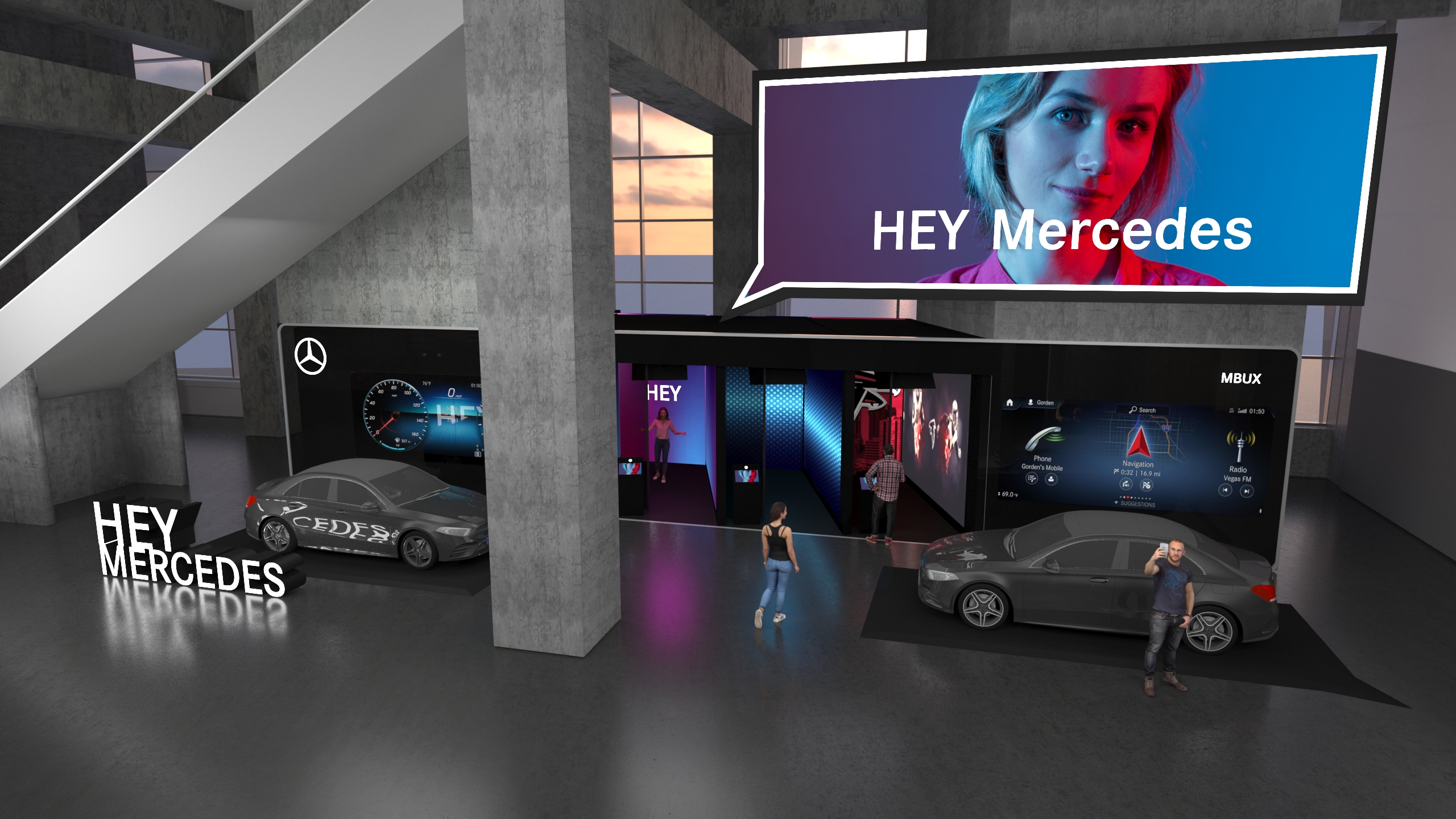 After the 2018 Super Bowl in Atlanta, GA we were tasked with re-designing the Mercedes Benz activation spaces located inside the Mercedes Benz Stadium. The right entrance speaks about the "MBUX technology" in an appeal to younger generations with a fun and approachable feel.
