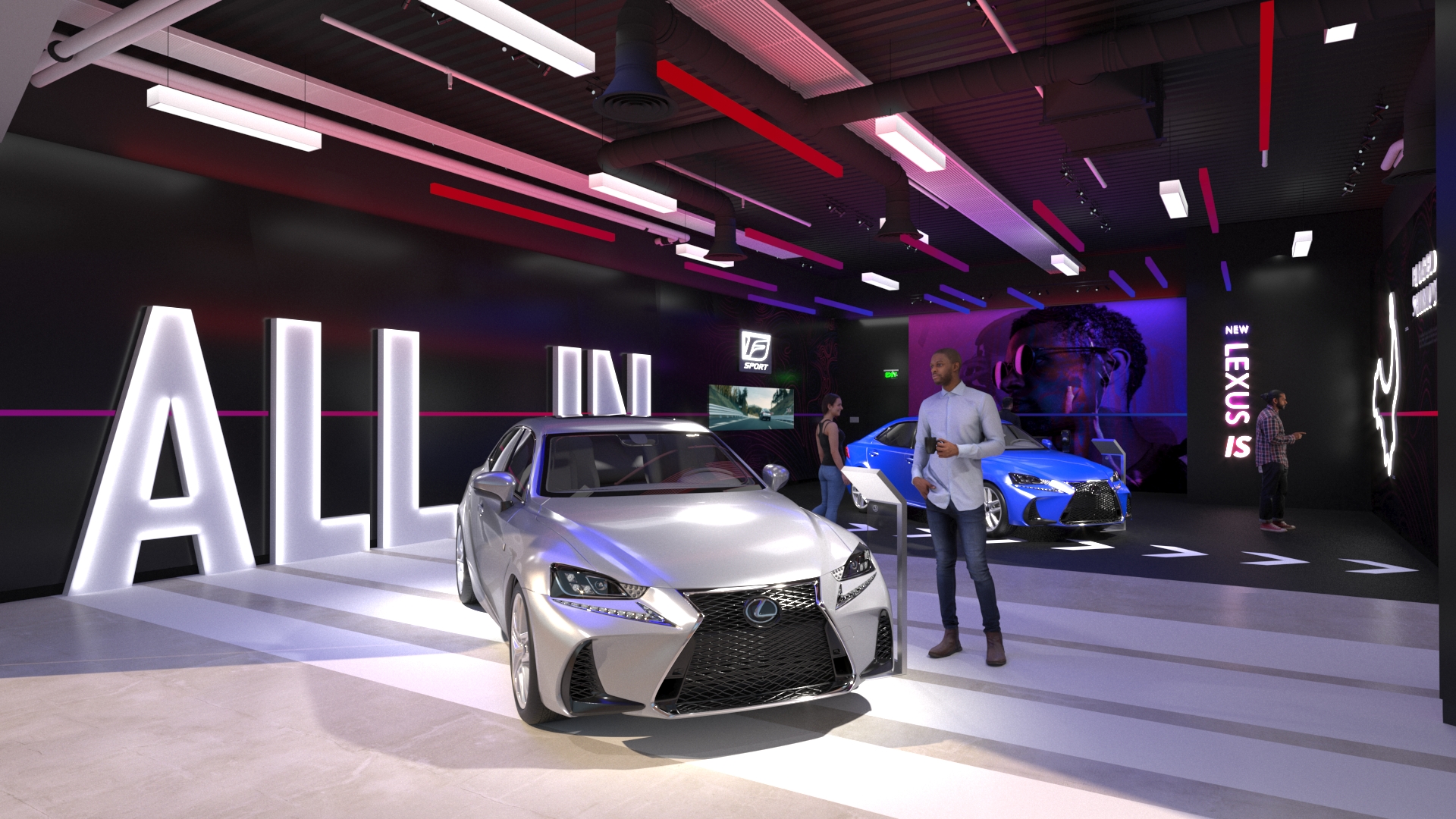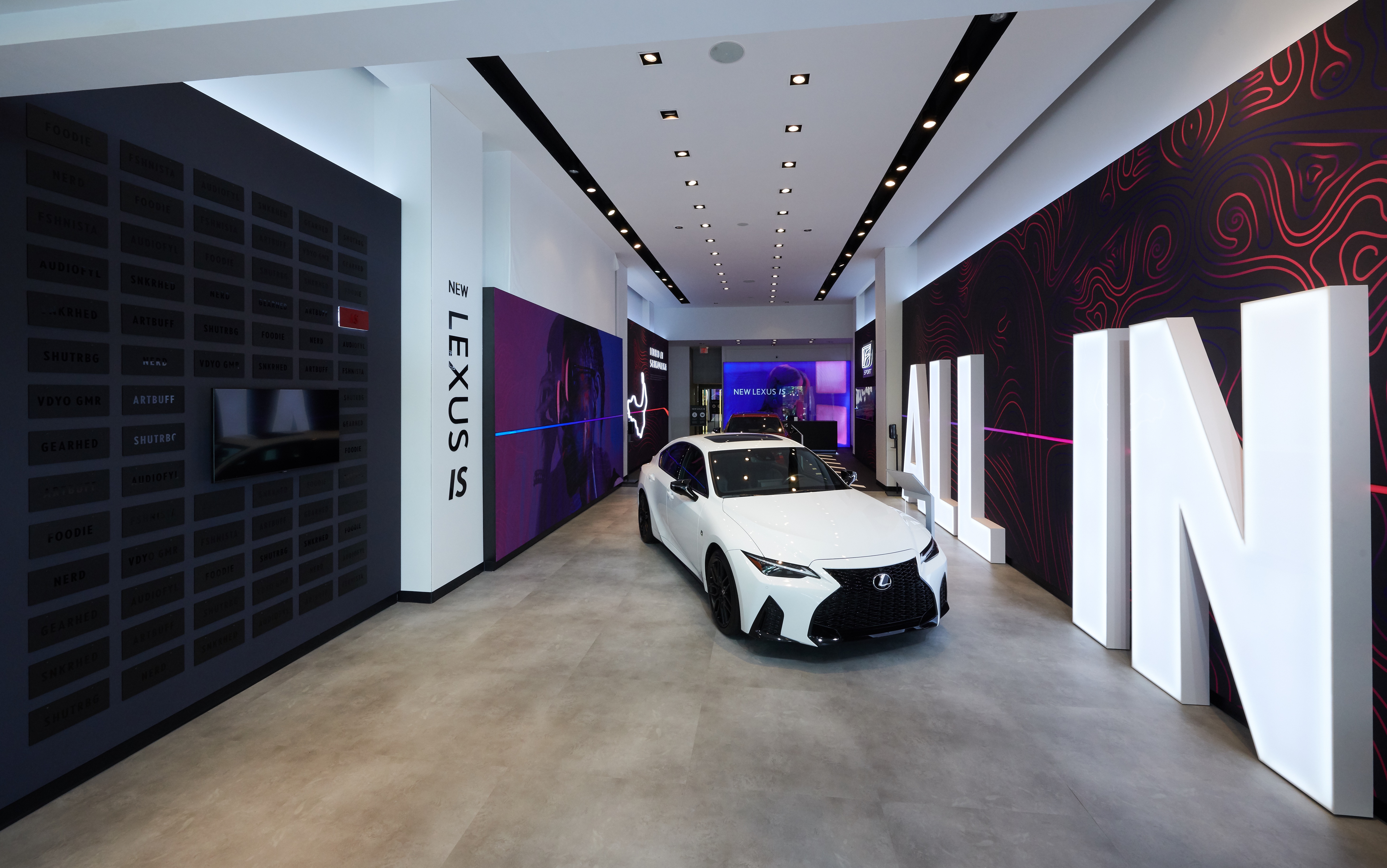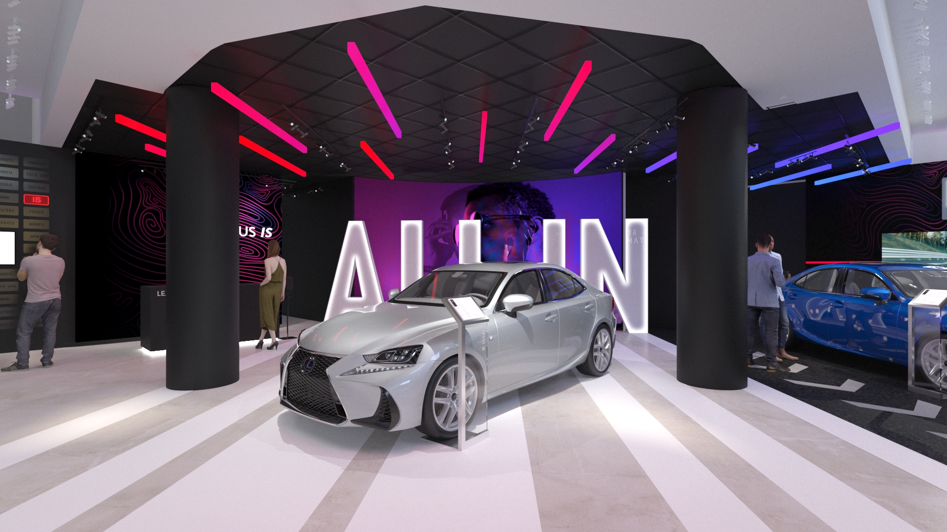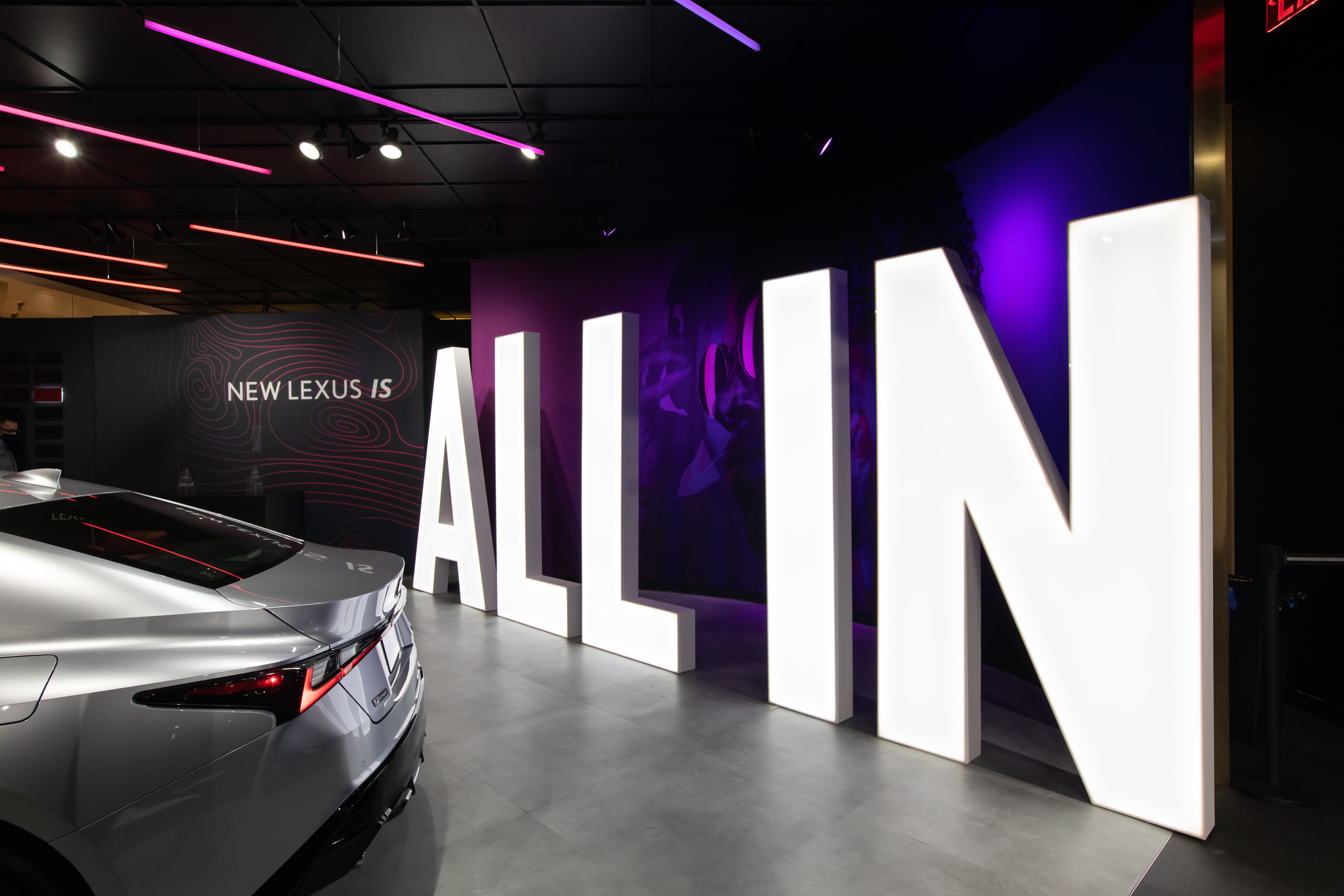 Inspired by the Lexus “ALL IN” campaign, directed to the Bold and Young personalities for the launch of the NEW IS 2021 Model, we took some of the most unique details from the vehicles, colors and movement to create a daring space full of self- discovery and story telling that embraces people taking their time to explore in a safe environment.