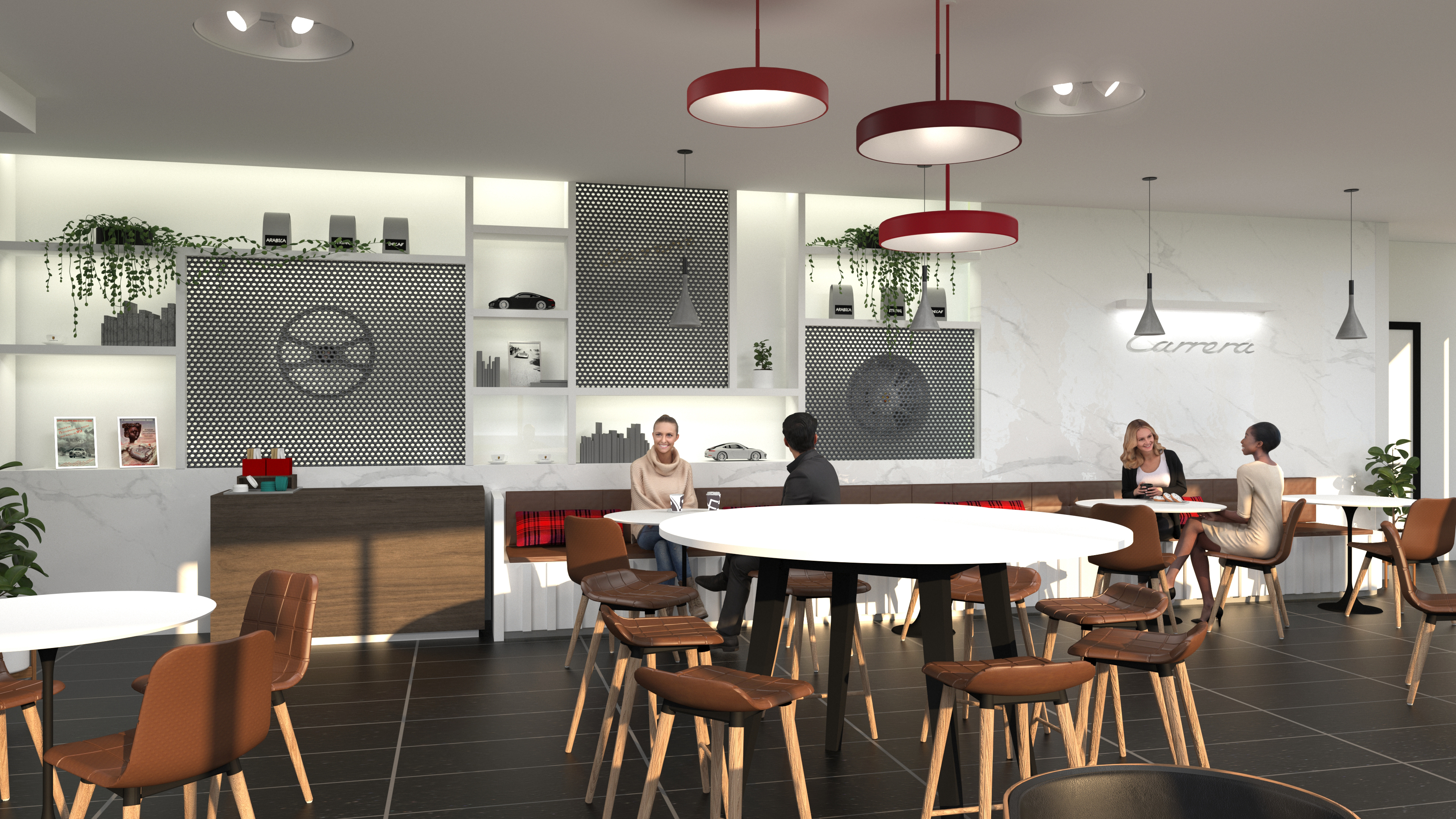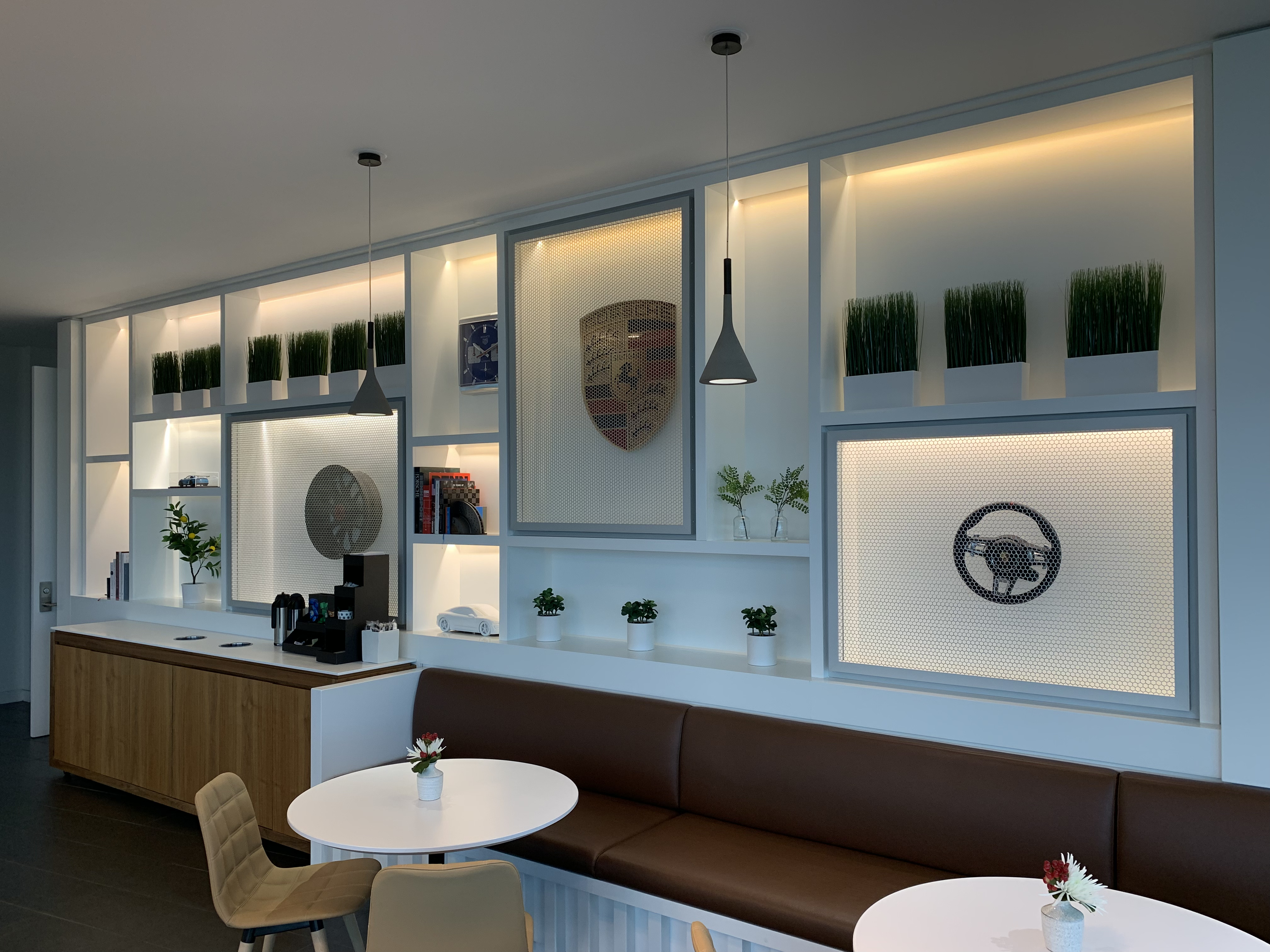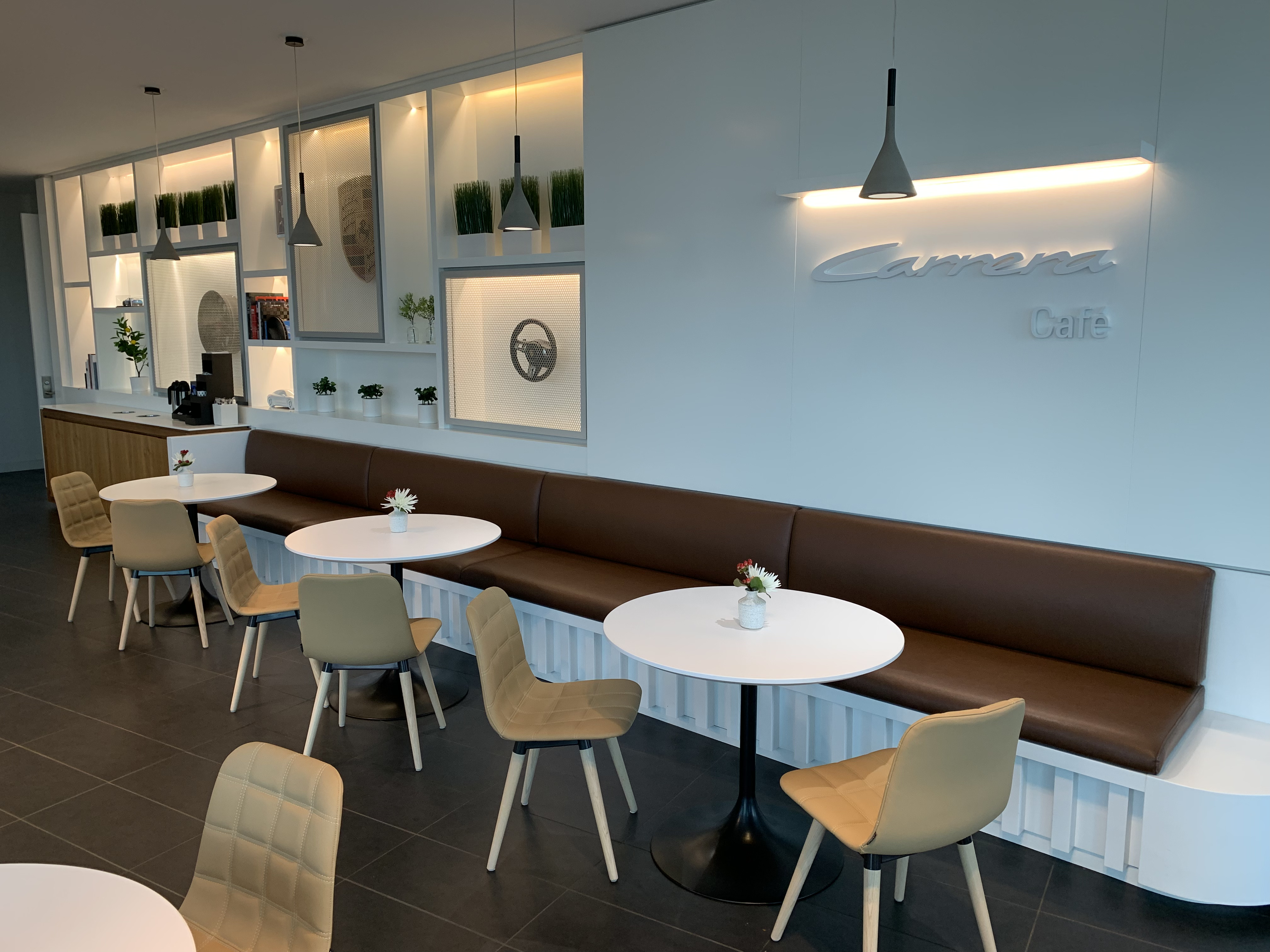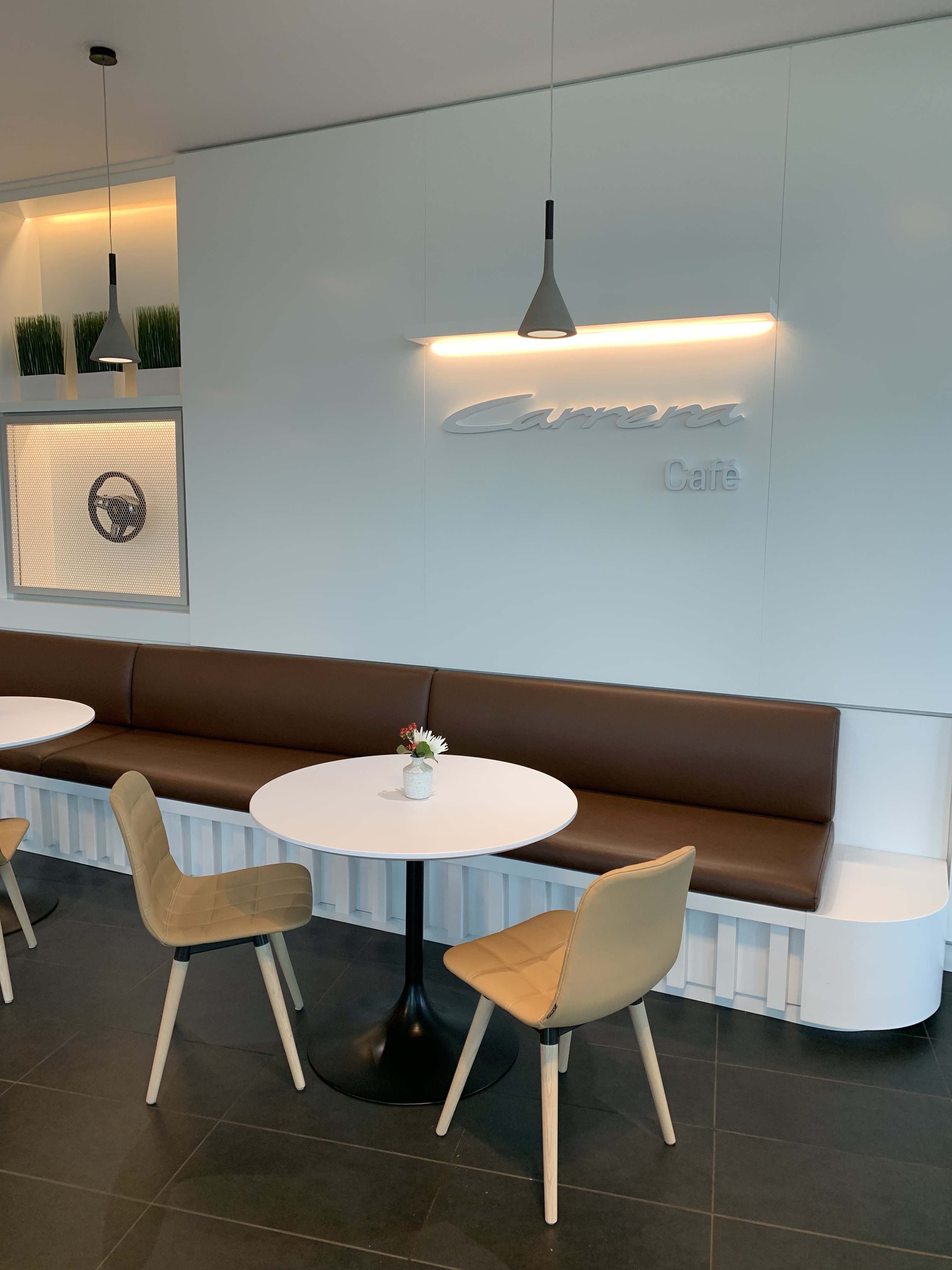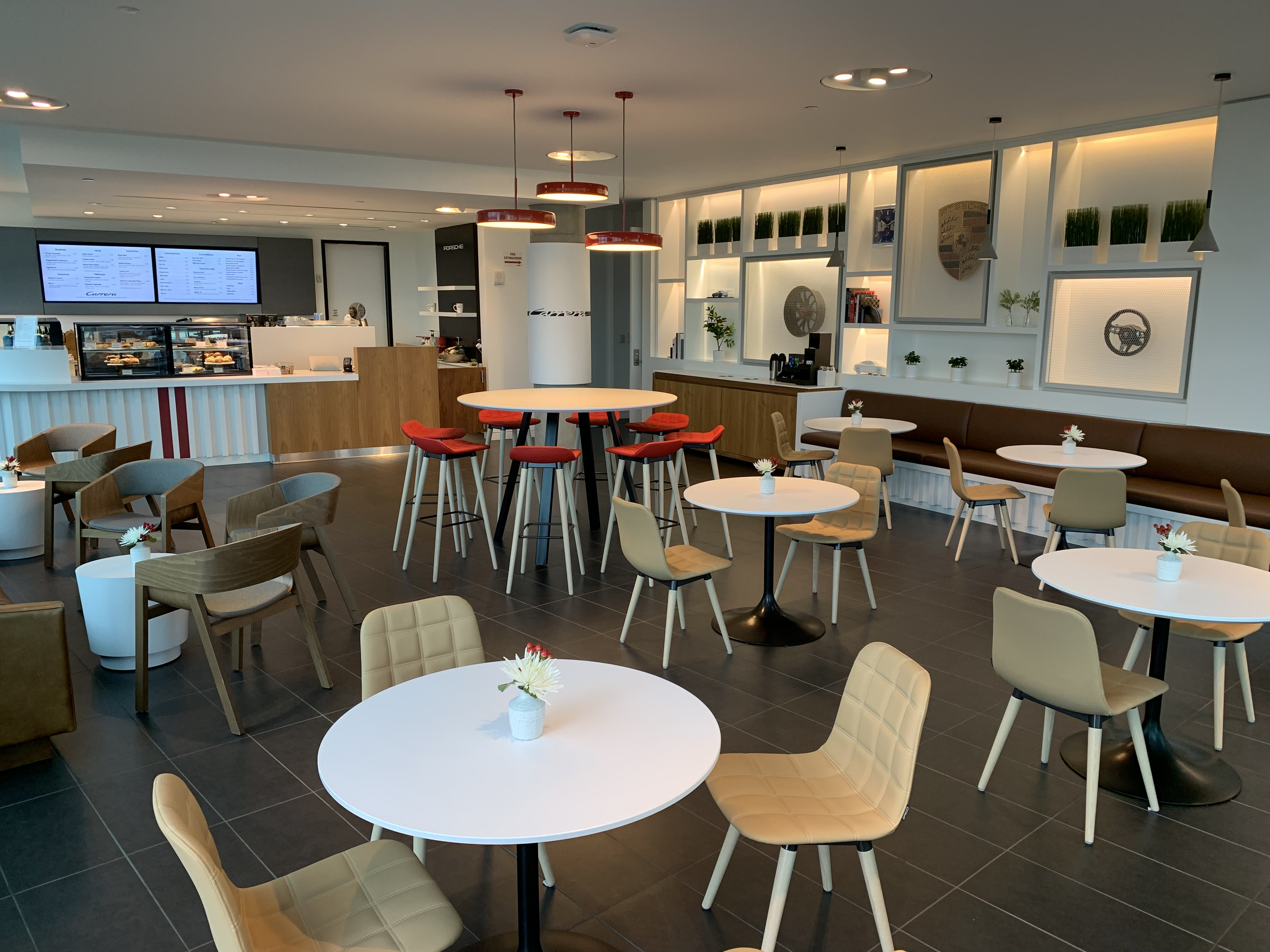 The objective was to create a space that serves employees and visitors functionally and aesthetically. The space feels warm and inviting to facilitate conversation and relaxation. By using the timeless Carrera model as the main inspiration, the vehicle story is told by connecting parts, materials, form and artifacts. The aesthetic of the space is cozy modern – predominantly bright and white with hints of red and brown leather.