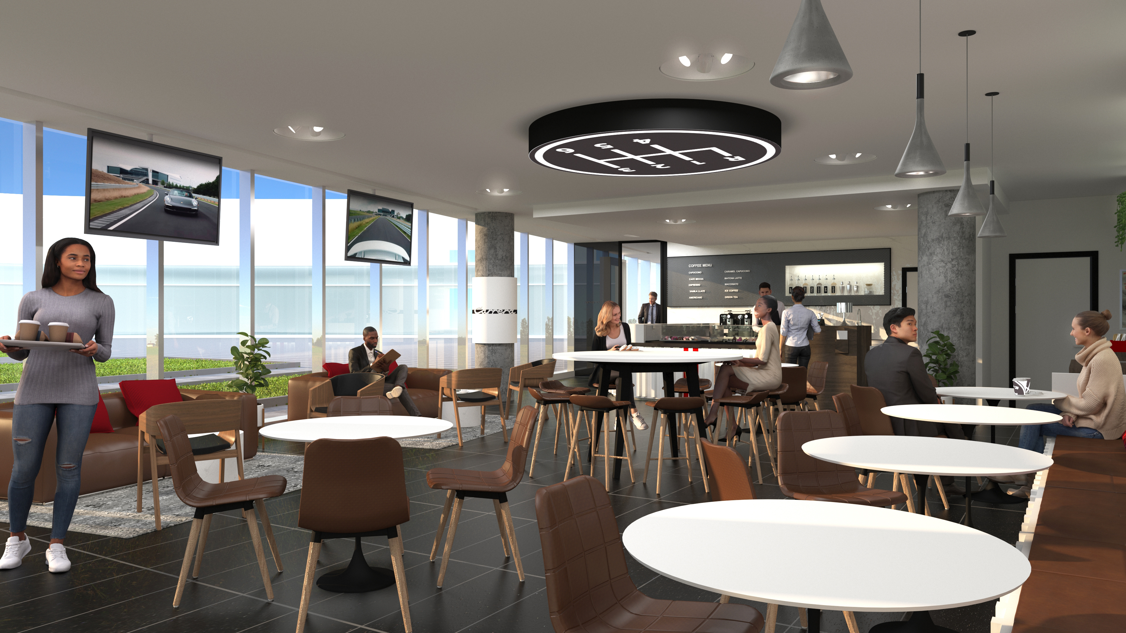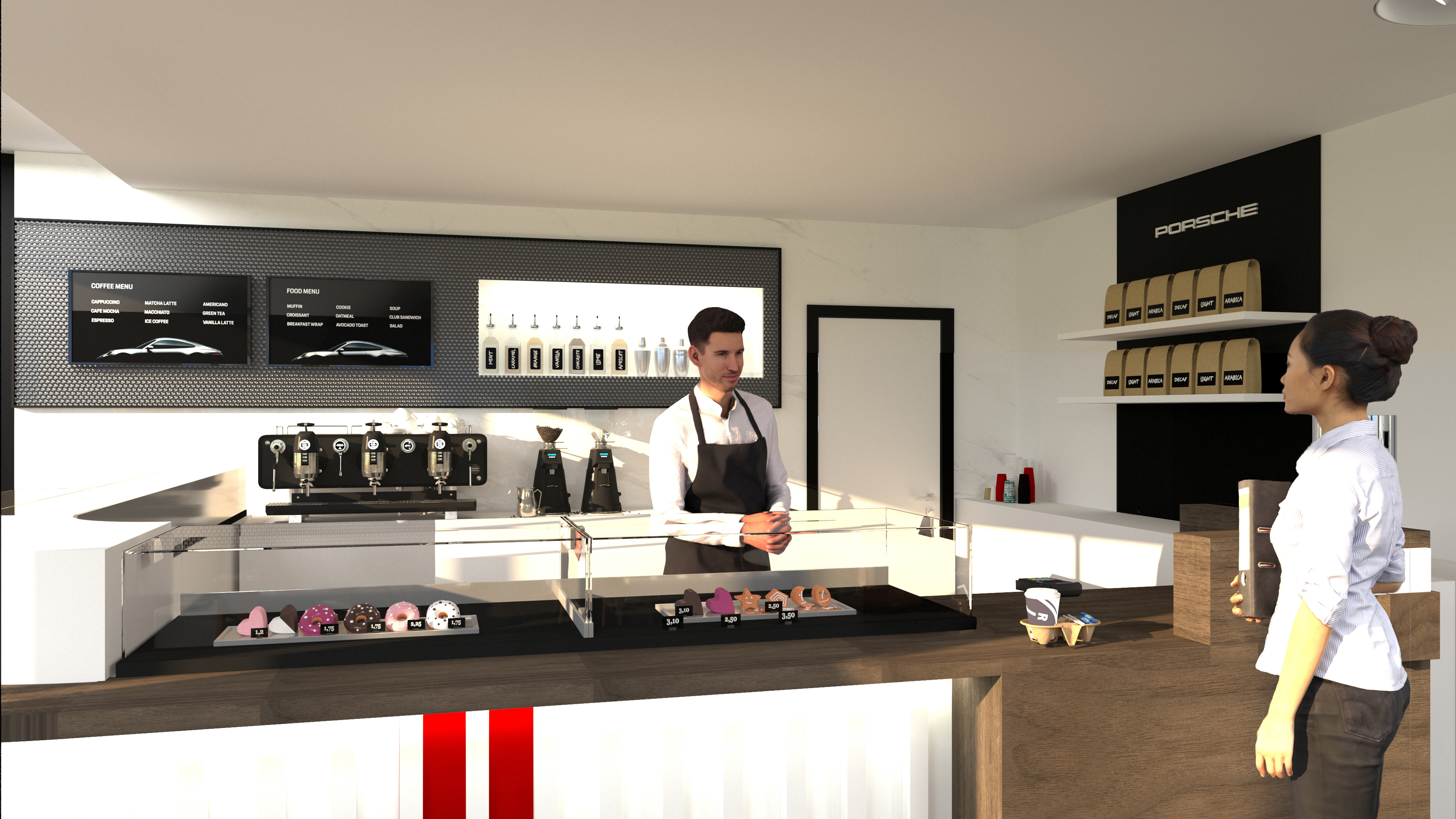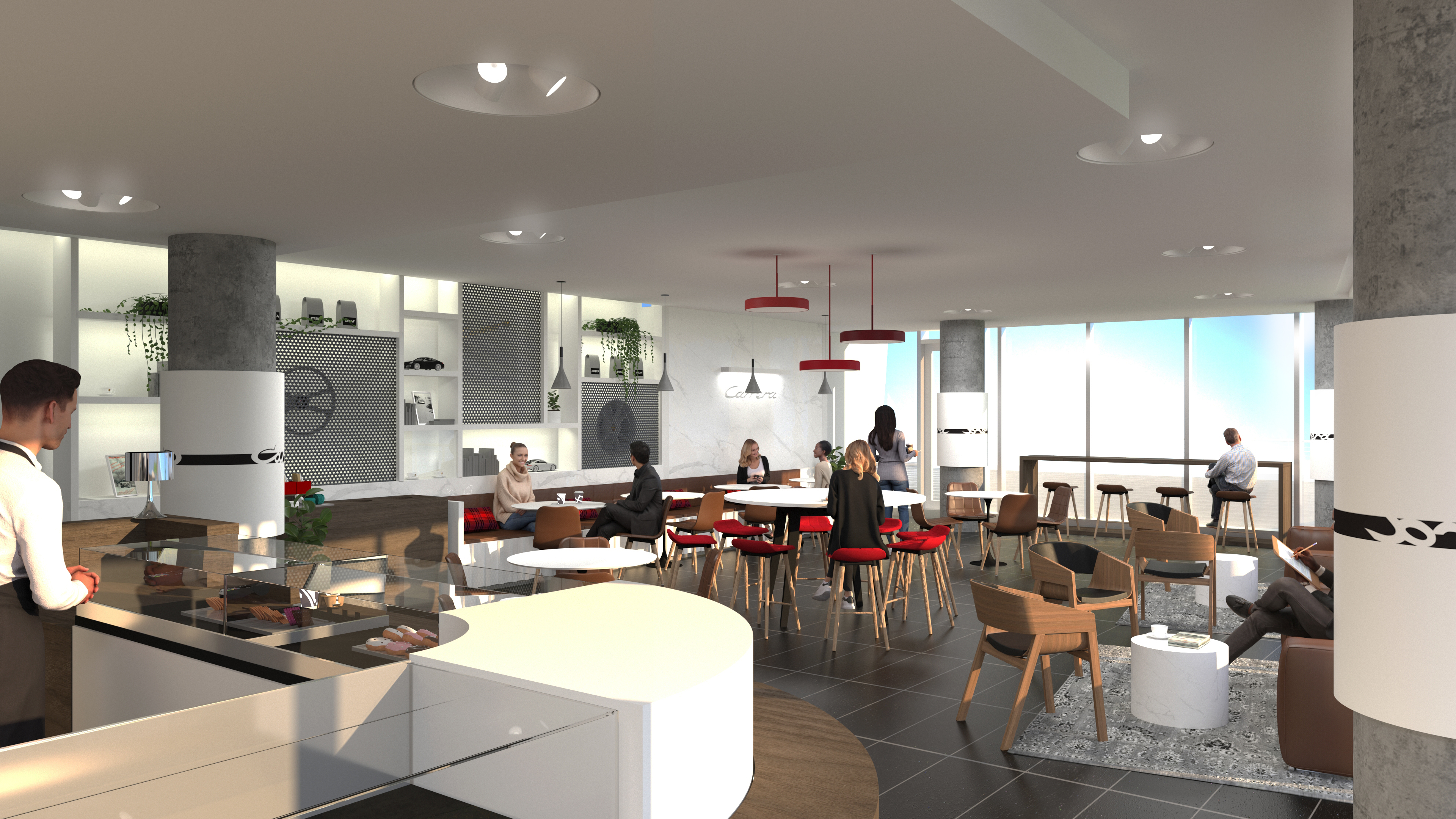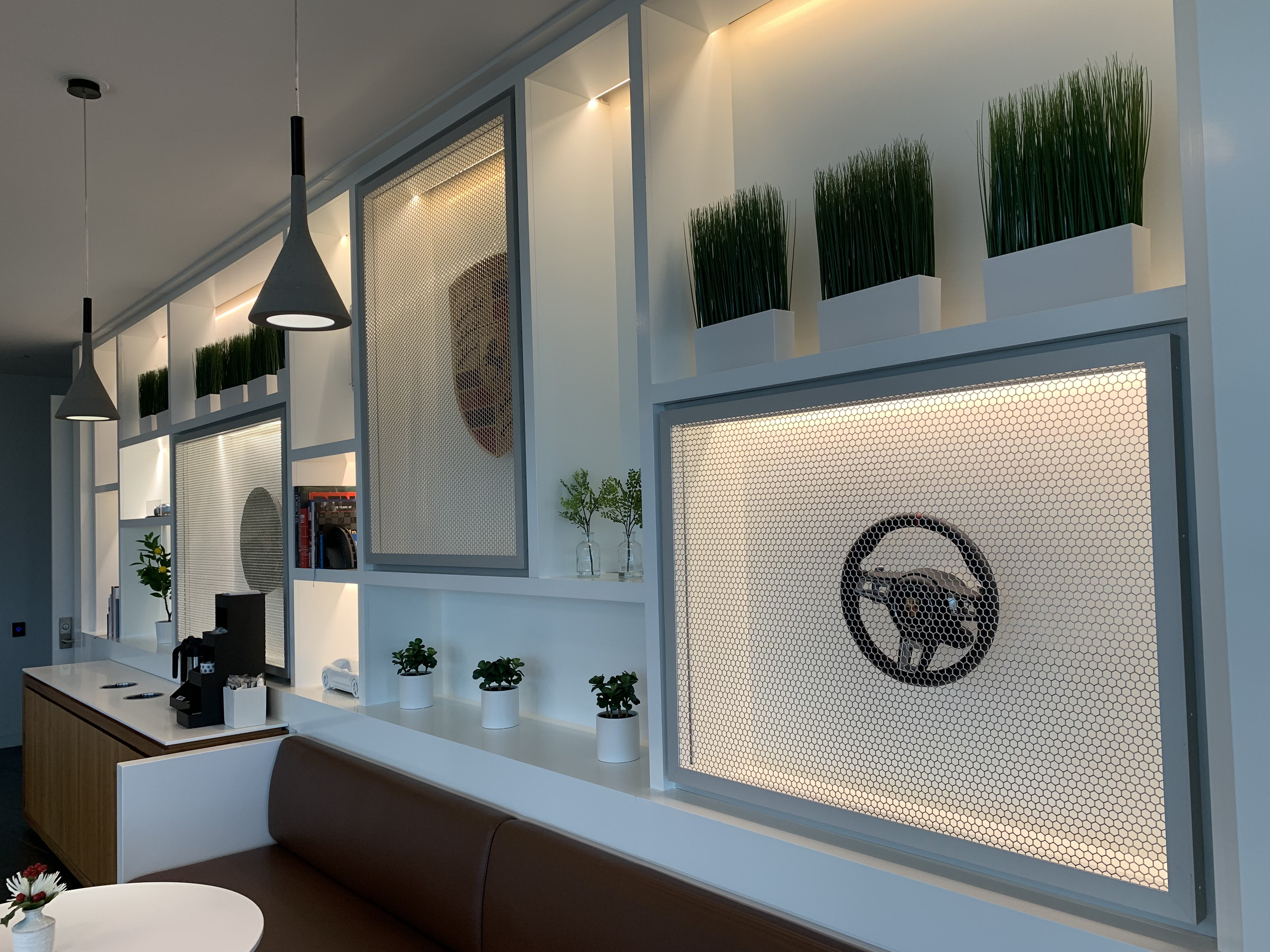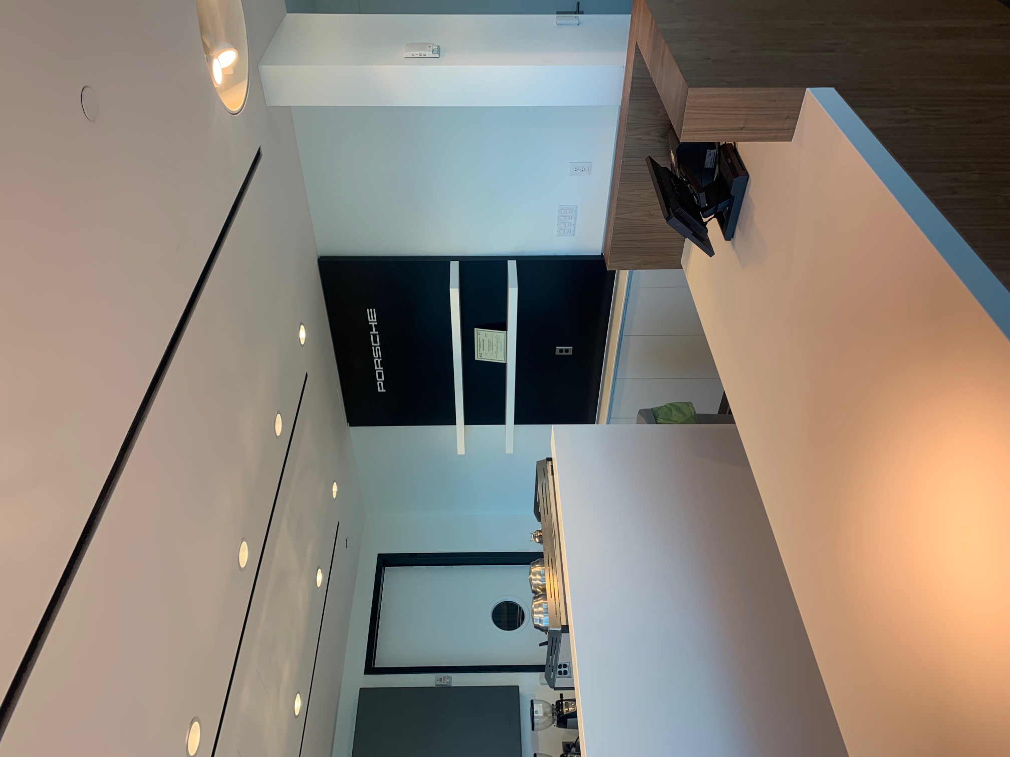 The objective was to create a space that serves employees and visitors functionally and aesthetically. The space feels warm and inviting to facilitate conversation and relaxation. By using the timeless Carrera model as the main inspiration, the vehicle story is told by connecting parts, materials, form and artifacts. The aesthetic of the space is cozy modern – predominantly bright and white with hints of red and brown leather.