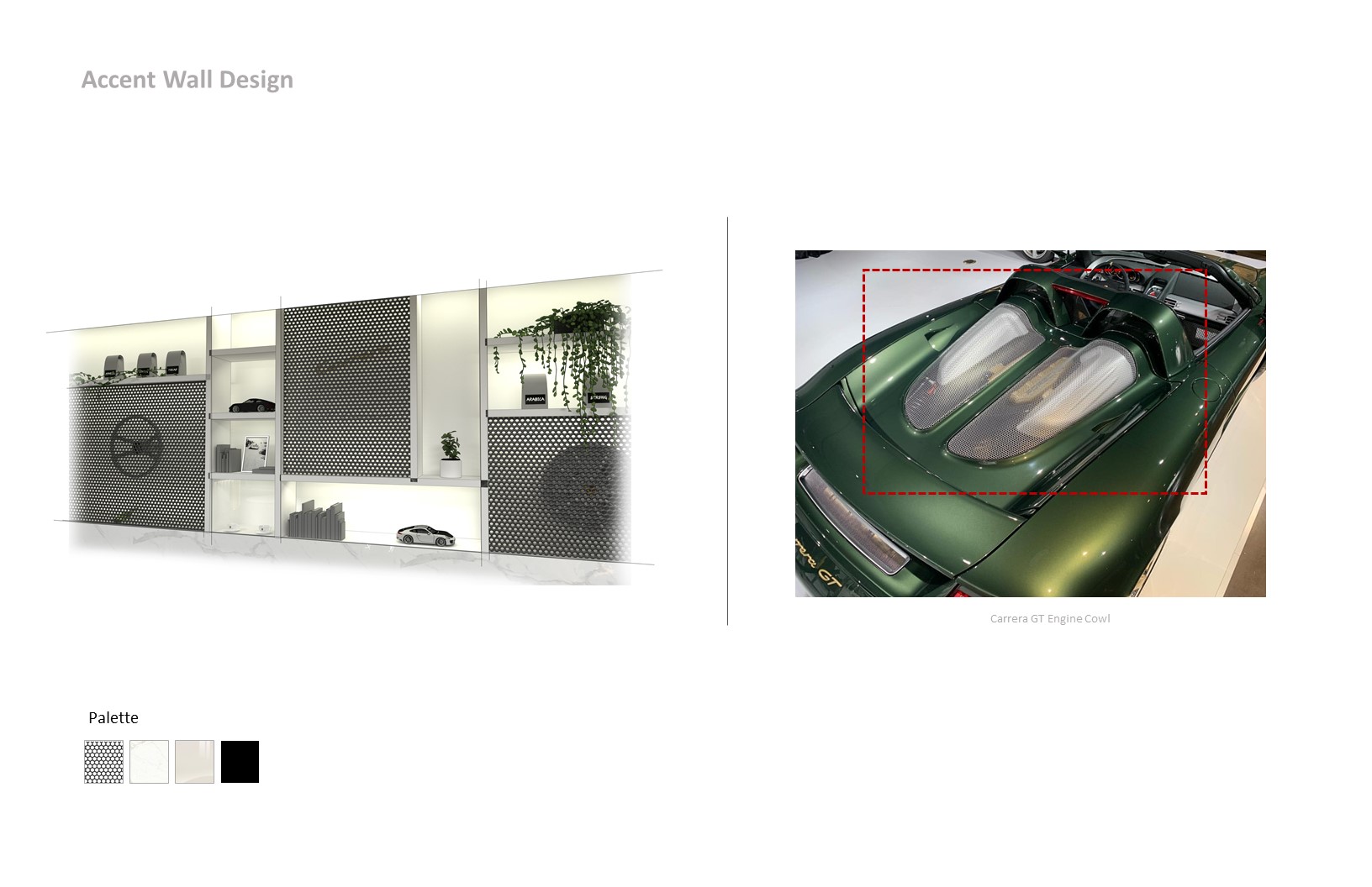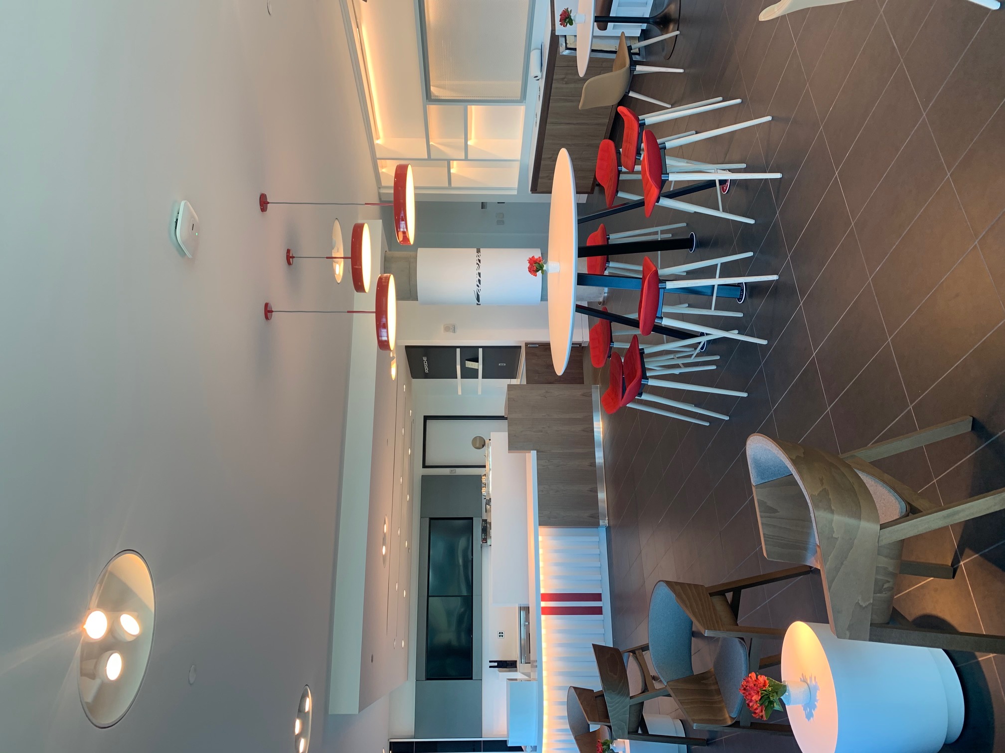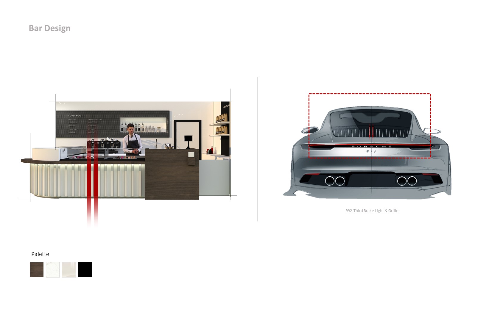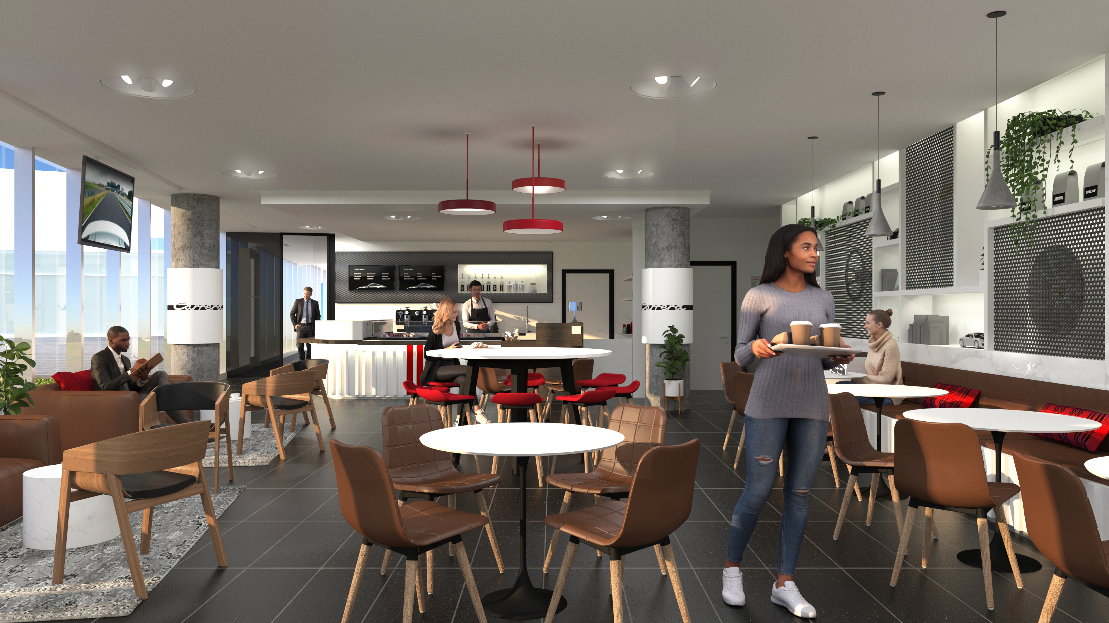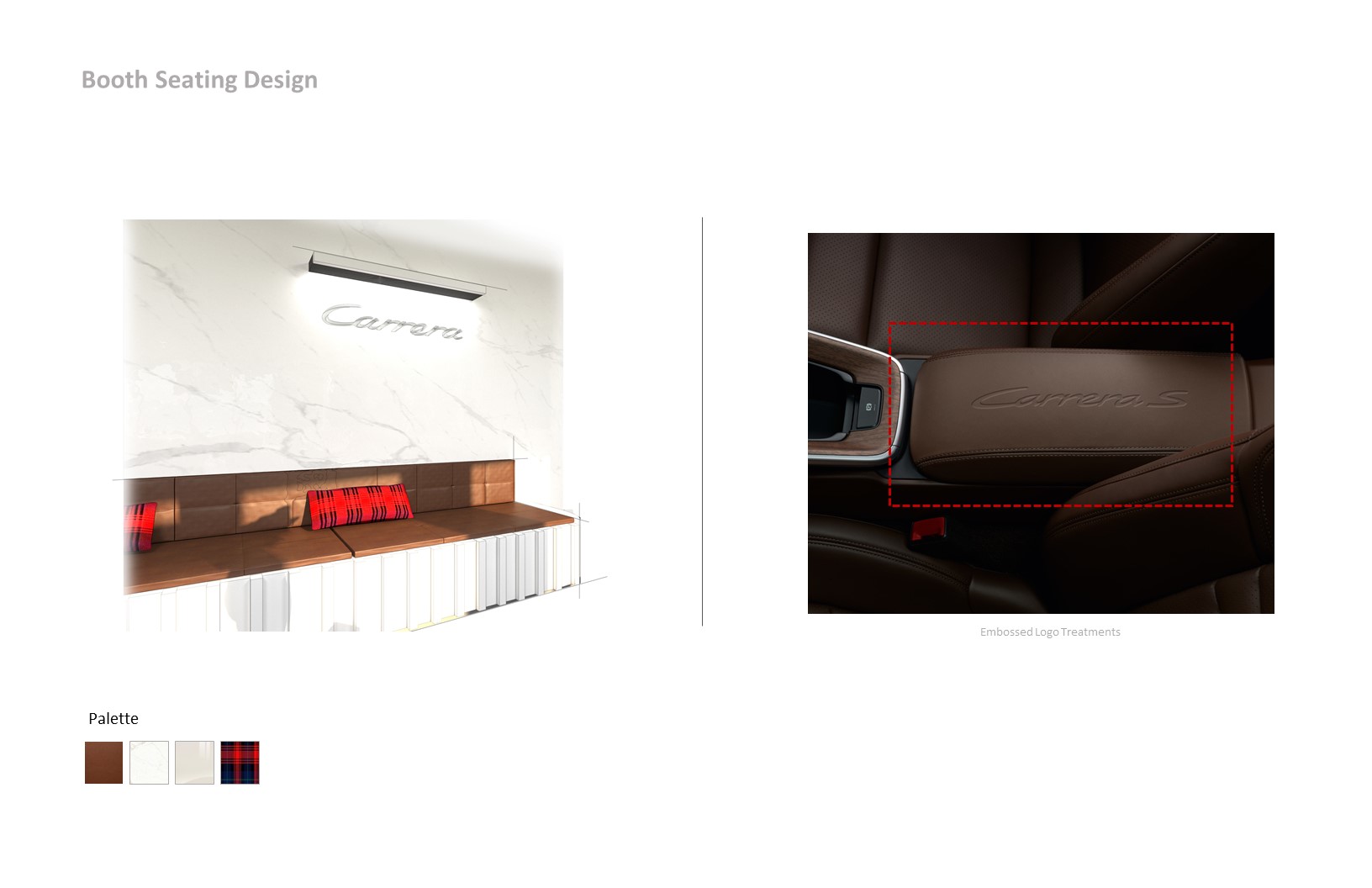 The objective was to create a space that serves employees and visitors functionally and aesthetically. The space feels warm and inviting to facilitate conversation and relaxation. By using the timeless Carrera model as the main inspiration, the vehicle story is told by connecting parts, materials, form and artifacts. The aesthetic of the space is cozy modern – predominantly bright and white with hints of red and brown leather.